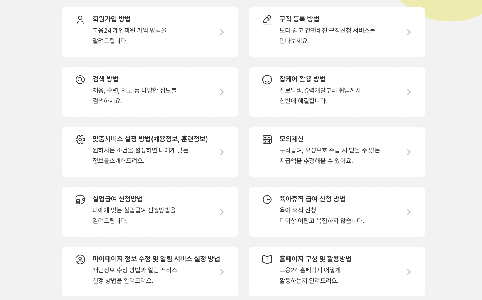 고용24 홈페이지 통해서 채용정보, 취업지원, 실업급여, 국민내일배움카드, 출산휴가, 육아휴직 급여, 구인신청 등 고용, 출산, 취업 교육에 관한 모든 업무를 하실 수 있습니다. 아래의 내용을 확인하시고, 고용24 로그인 후에 사용하세요.