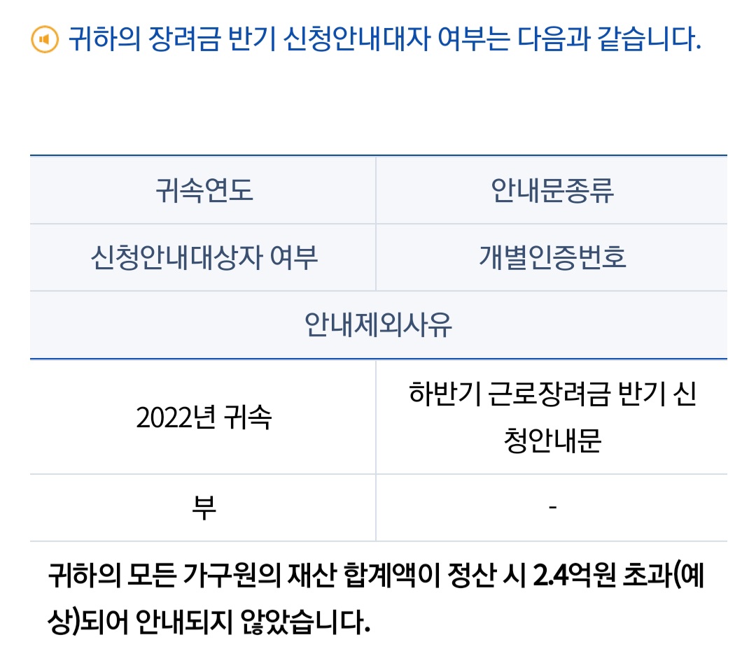 (5) 국세청 로그인을 하면, 아래와 같이 근로장려금 신청 대상자 여부에 대해서 확인을 할 수 있습니다.