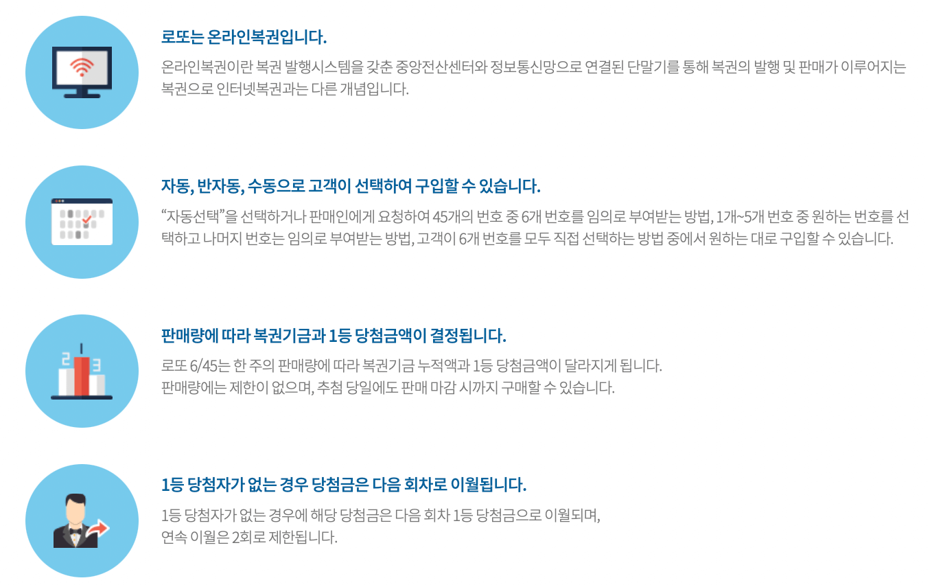 로또6/45 복권은 온라인 또는 오프라인으로 구입하실 수 있습니다. 구입은 매일 6시 ~ 24까지 구입가능하며, 1인 1회차 최대 5,000원 구매 가능합니다. 5만원 이하 당첨금은 추첨 익일에 예치금으로 자동 충전이 됩니다.