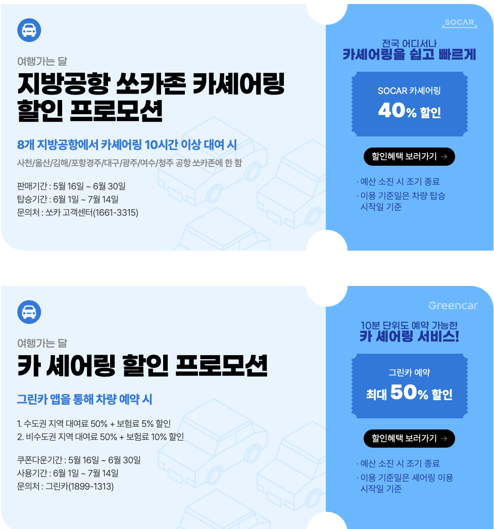 | 교통혜택(철도, 항공, 카셰어링, 시티투어) | 숙박혜택(국내 숙박, 캠핑장, 한국관광 숙소) |