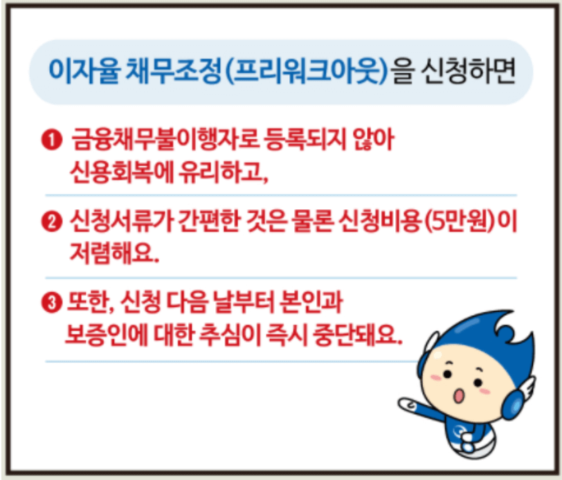 프리워크아웃 지원 혜택은 이자율 인하, 분할상환, 채무감면 등이 있습니다.
