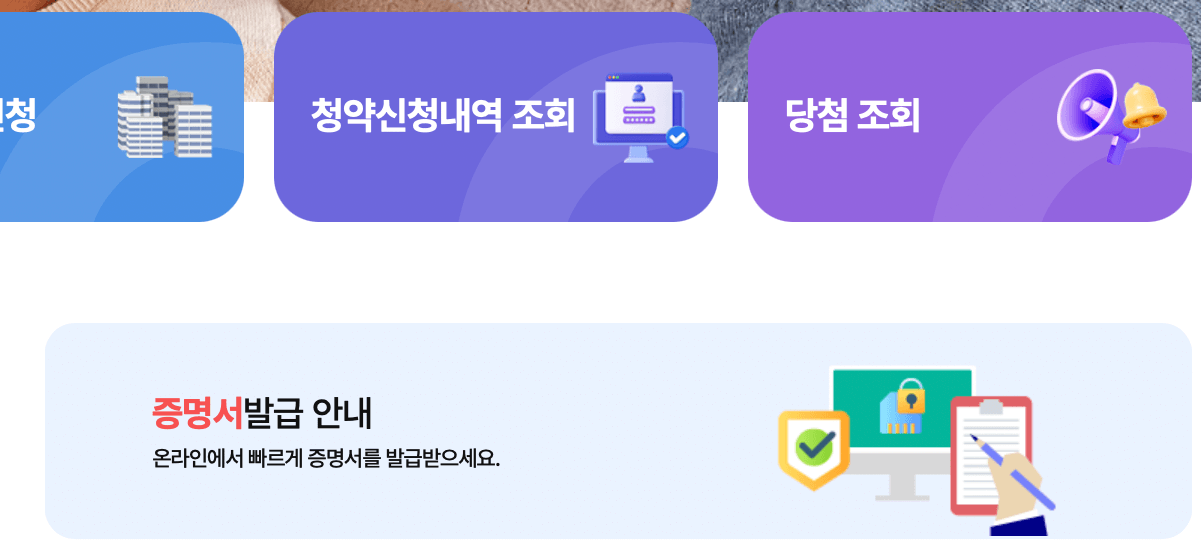 | 청약신청내역 및 결과조회 | 전환보증금 신청 | 증명서 진위확인 | |